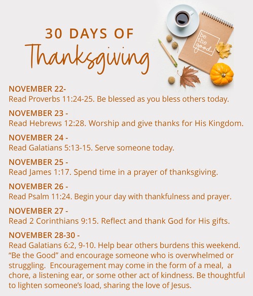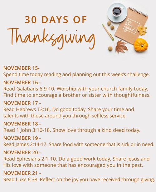 We are going to focus on giving thanks throughout the month of November. "30 Days of Thanksgiving" will help us develop habitual gratitude and challenge each of us to express thankfulness through words and deeds of selfless service.